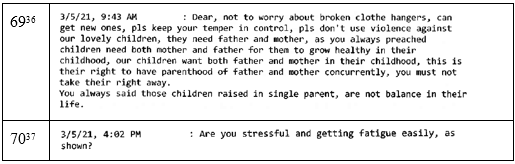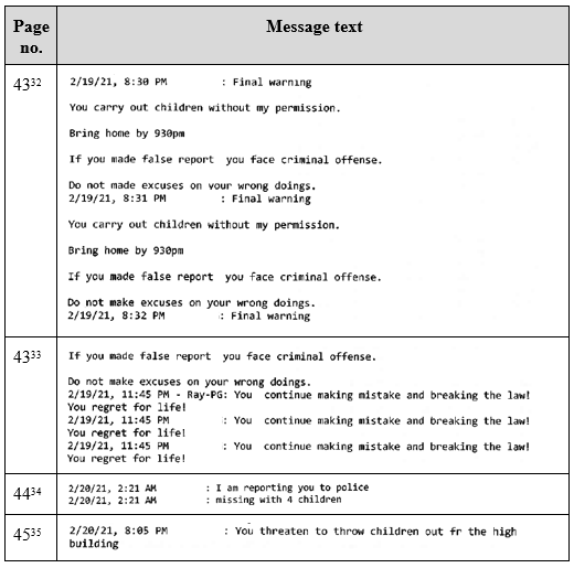 15.In addition to these missed calls, the Husband had also sent numerous test messages to the Wife which she stated were calculated to cause her harassment, alarm, and distress. For example, he had accused her of not being mentally stable, not being able to control her temper, and being guilty of mistreating the children, all of which the Wife claims are false allegations. In giving oral evidence, the Wife took the court through each of these specific messages sent to her by the Husband which she felt had caused her harassment. I have reproduced these messages in Annex 1 below.